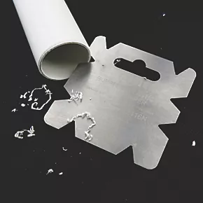 Designed to deburr ¾”, 1¼”, 1½” and 2″ waste pipe. Stainless steel laser cut-out shape provides 4 profiles, 1 for each of the sizes. Deburrs and chamfers both the inside and outside, readying the pipe for solvent welding.